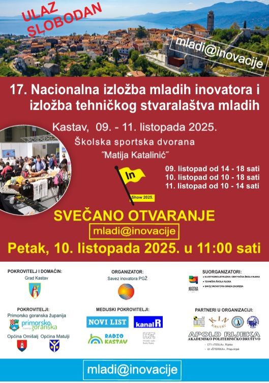 Grad Kastav od 09. do 11. listopada ovogodišnji domaćin 17. Nacionalne izložbe mladih inovatora i tehničkog stvaralaštva, u Školskoj sportskoj dvorani “Matija Katalinić” otvorena je izložba koju organizira Savez inovatora Primorsko-goranske županije, uz značajnu podršku Saveza riječkih inovatora i Elektroindustrijske i obrtničke škole Rijeka, a koja okuplja
